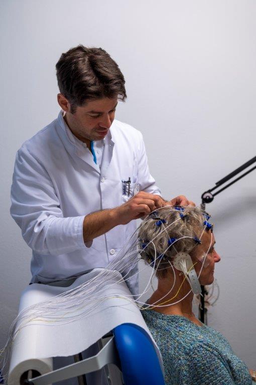 The examination takes place in a comfortable chair. An elastic cap is placed on the head, and surface electrodes are placed underneath to record the brain’s electrical activity. The patient should sit in a relaxed posture during the examination and keep the eyes loosely closed. Movements such as talking, coughing, swallowing or blinking are recorded and can mask the EEG waveform, so these should be avoided.